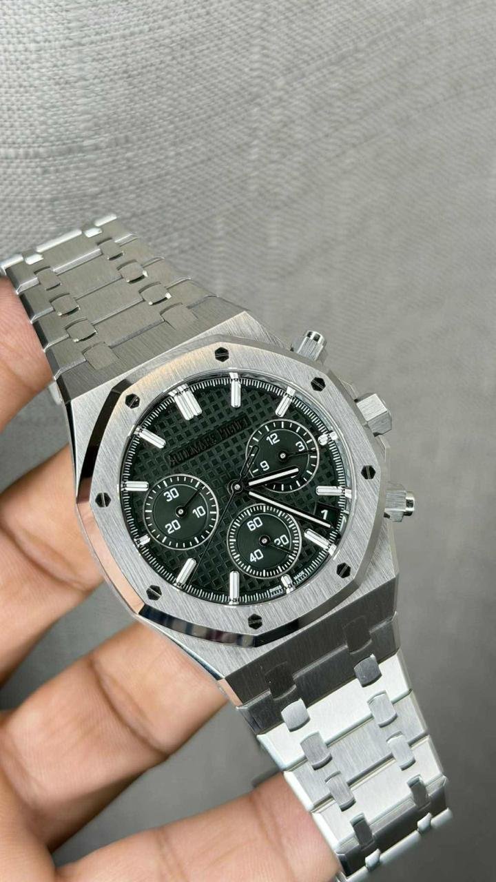 تتميز بعقارب دقيقة ومؤشرات ثانوية، تحافظ على تصميم Royal Oak الأيقوني مع إضافة وظيفة قياس الوقت المتسلسل للأغراض الرياضية والمهنية.